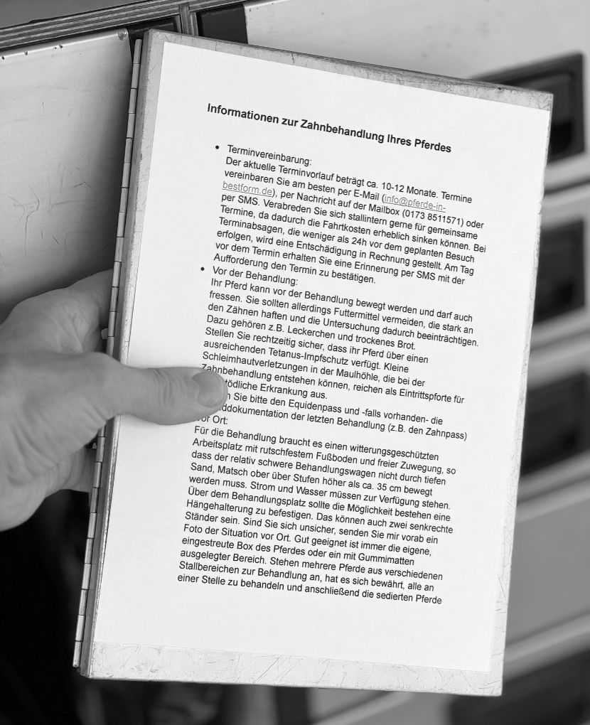 Bringen Sie bitte den Equidenpass und -falls vorhanden- die Befunddokumentation der letzten Behandlung (z. B. den Zahnpass) mit.
